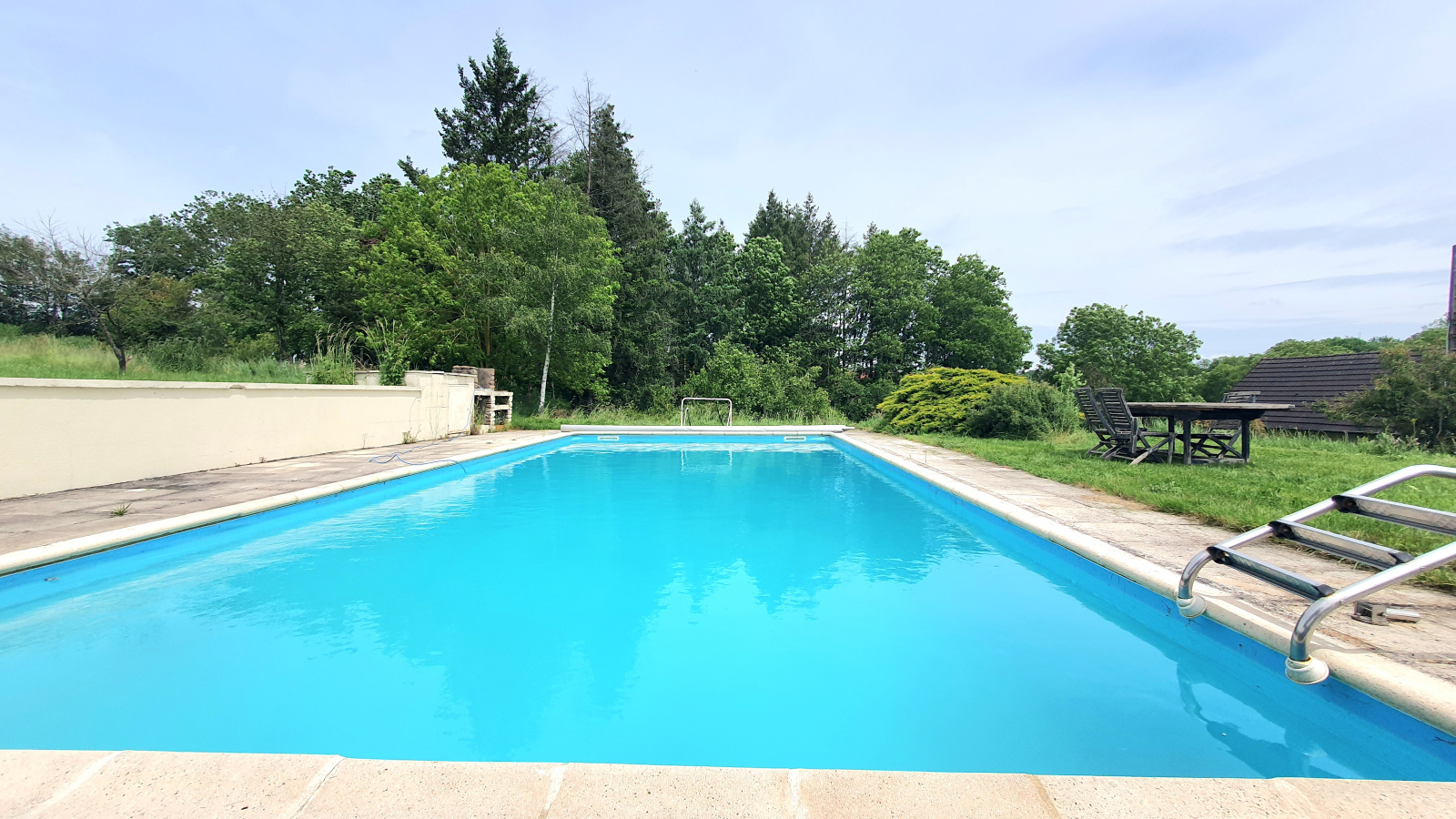 Piscine au sel avec électrolyseur, 11m x 5,5m, avec pergola et terrasse en bois.